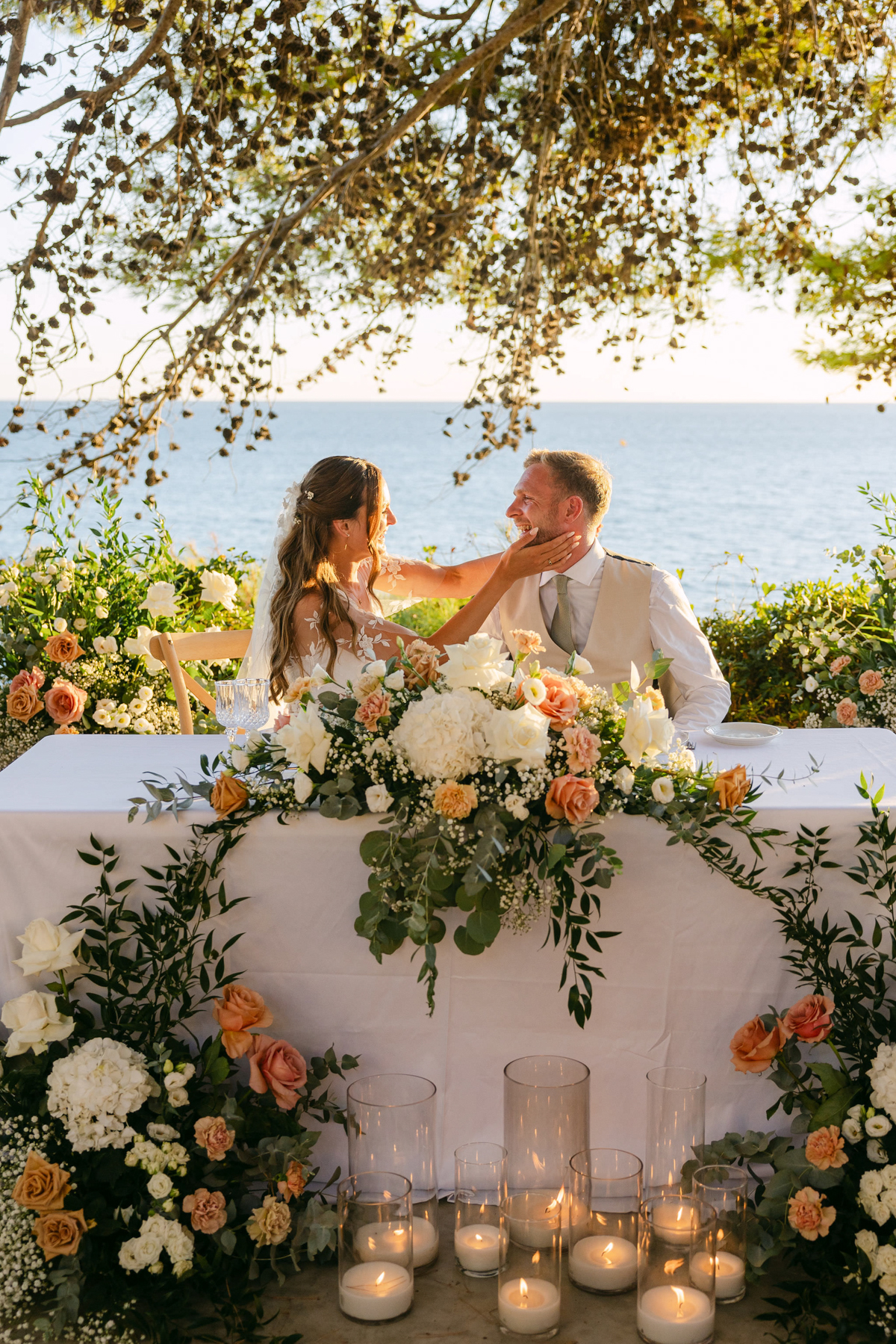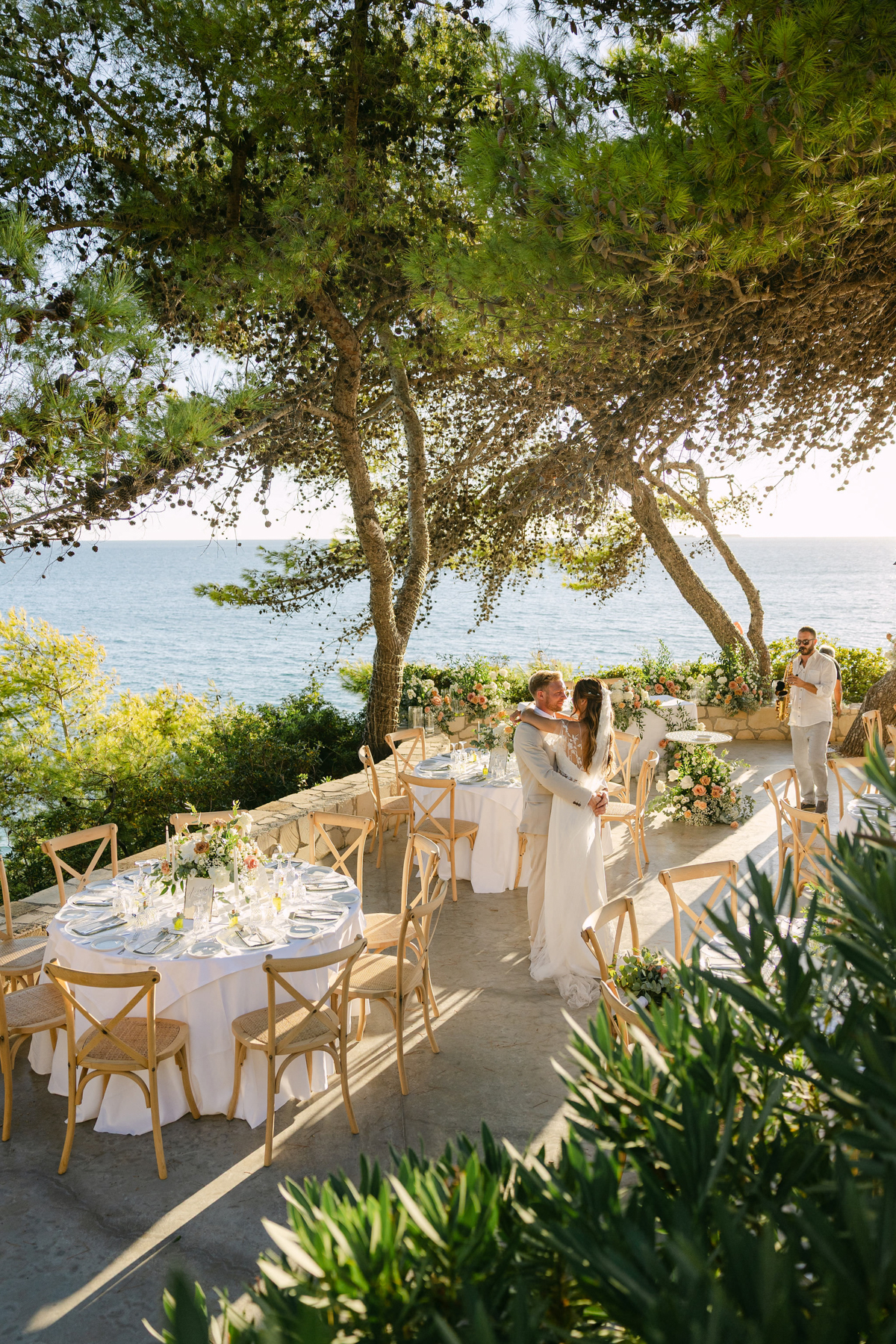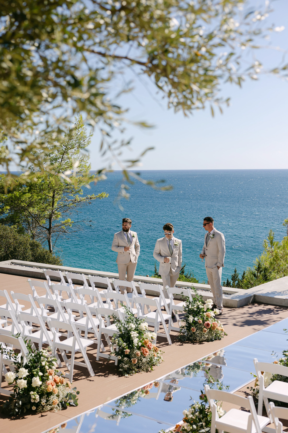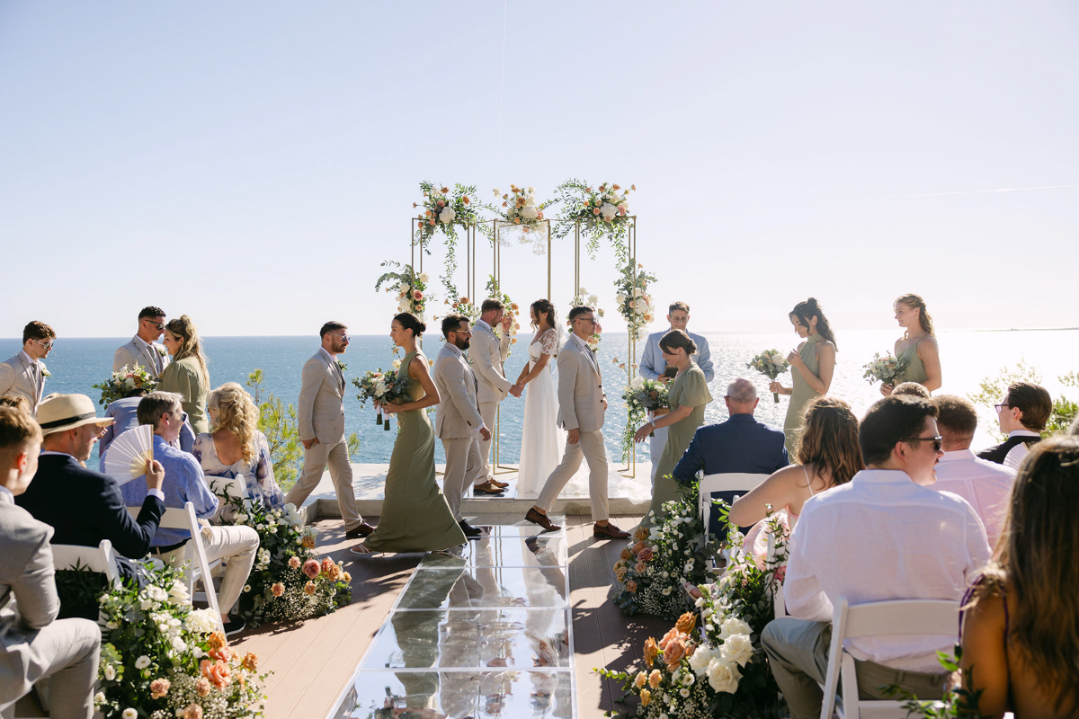The ceremony arch, adorned with cascading flowers and lush greenery, stood gracefully against the endless blue. It became the perfect frame for their vows — a quiet stage where the sea, the sky, and the wind bore witness.